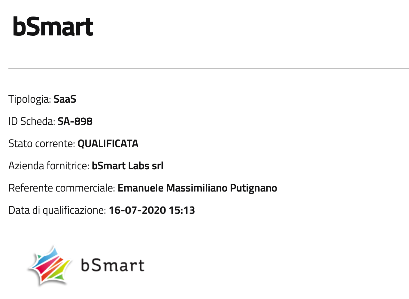 Il servizio SaaS erogato da bSmart Labs s.r.l. e denominato “bSmart” è qualificato AGID in aderenza alle Circolari AGID n. 2 e 3 del 9 aprile 2018 ed è presente sul “Catalogo dei servizi cloud qualificati per la PA”. Clicca qui per accedere alla scheda completa.